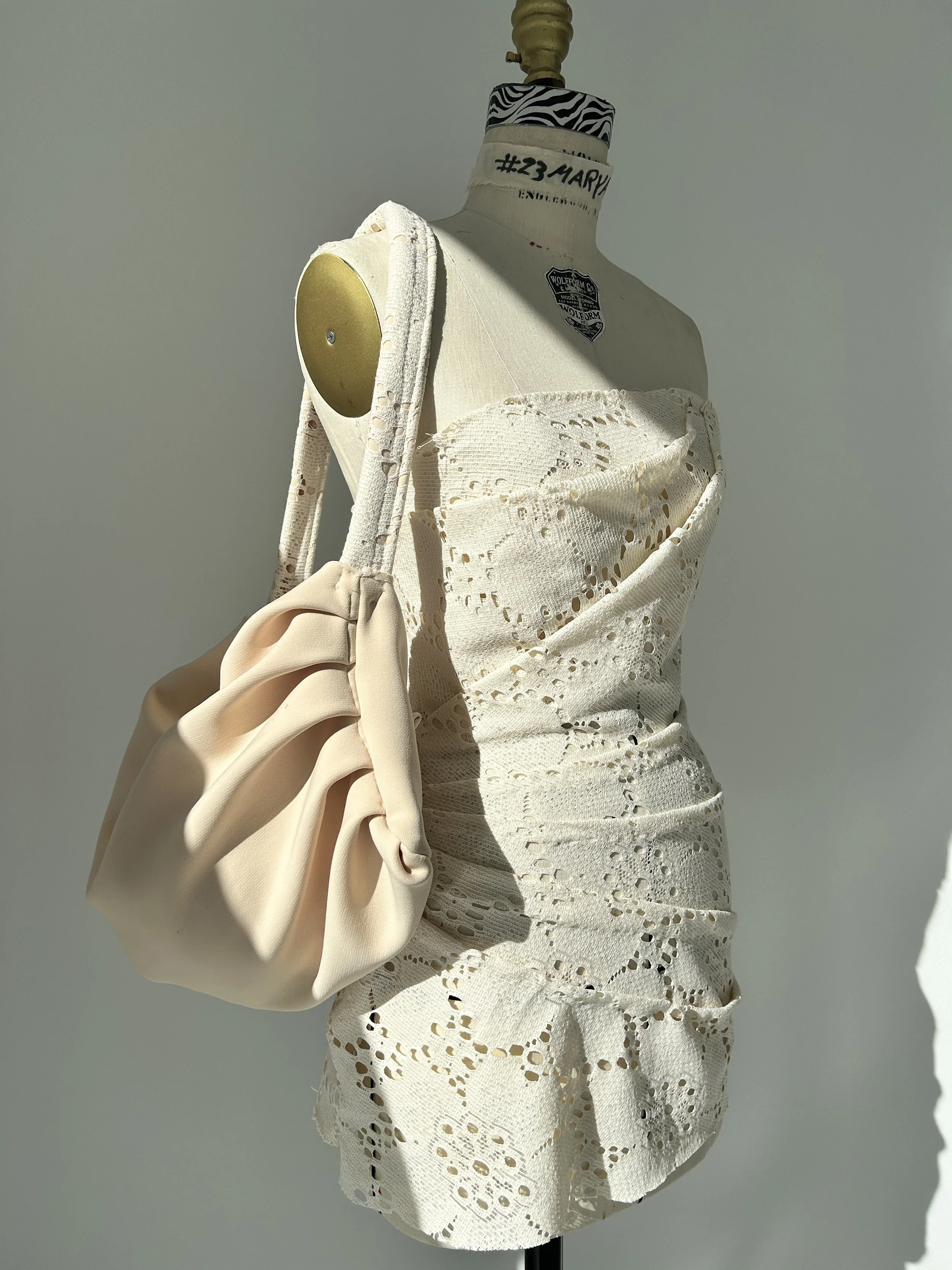 For my deliverable(s), a draped and 100% handsewn lace dress with a corset back. Alongside, a paired material bag with poly lining and a lace strap. The organic shape of the bag allows flexibility of storage within the bag and was able to be constructed using 4 seams and a handstitched strap attachment.